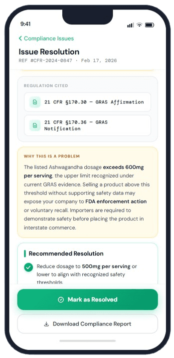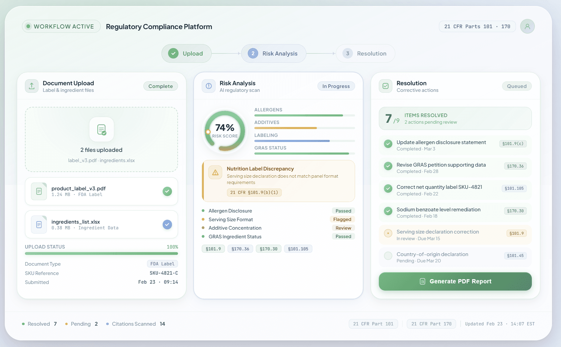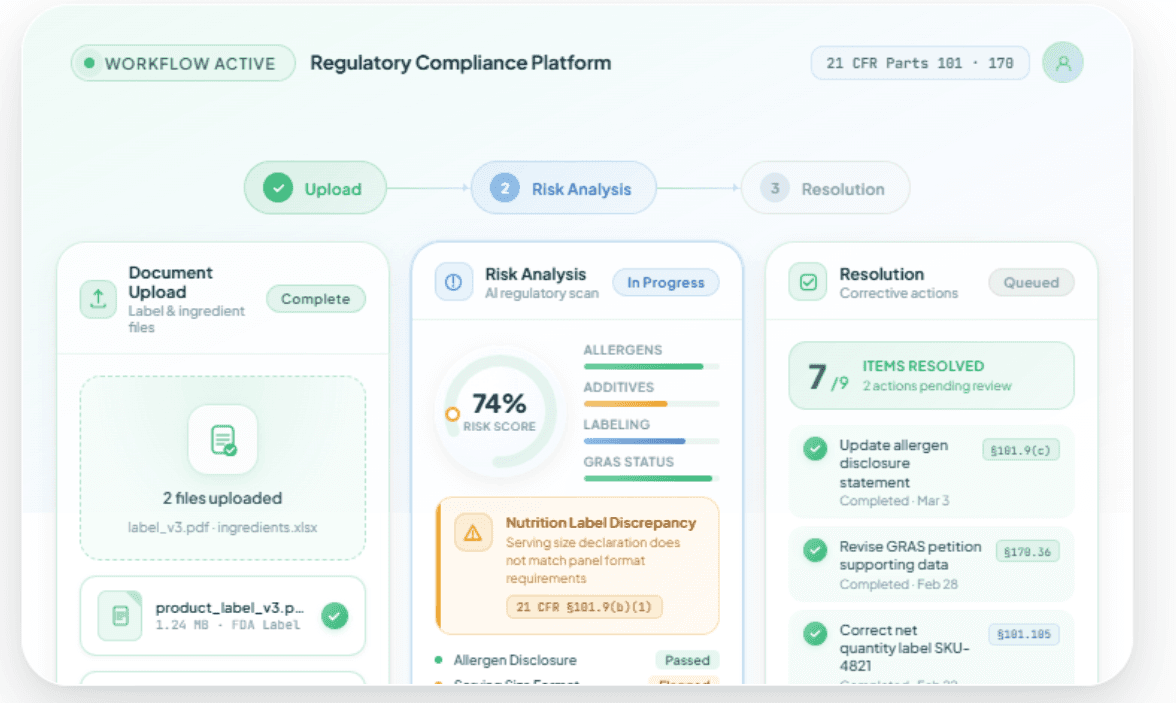 Instantly analyze labels, ingredients, and claims against FDA regulations and CFR standards. Detect regulatory violations before they become warning letters, shipment holds, or costly recalls.