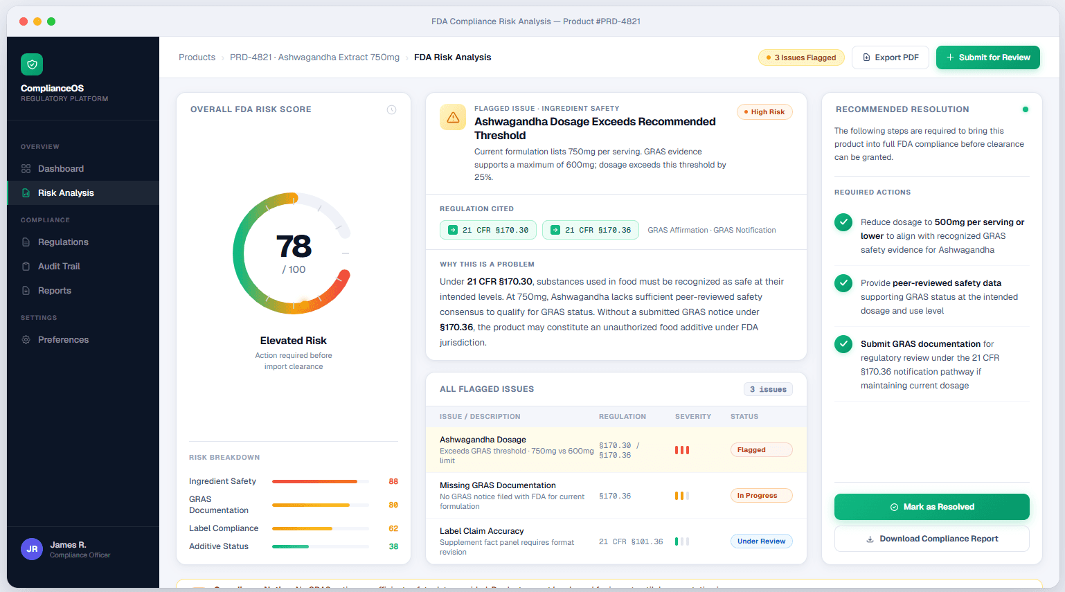 Komplyr analyzes labels, ingredients, and claims against FDA regulations in real time — preventing import holds, warning letters, and costly recalls.